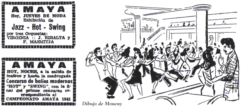 El Swing, en Barcelona, comenzaría en un bar, el Edén, también conocido como el bar de los negros, dónde se juntaban, alrededor de una gramola, los pocos apasionados que había entonces por la música de Louis Armstrong, Benny Goodman y otros músicos del momento. De ahí se extendería por toda la ciudad y se bailaría swing en salones como el Apolo, el Metropolitano, el Rialto o el Novedades, por citar algunos de ellos.