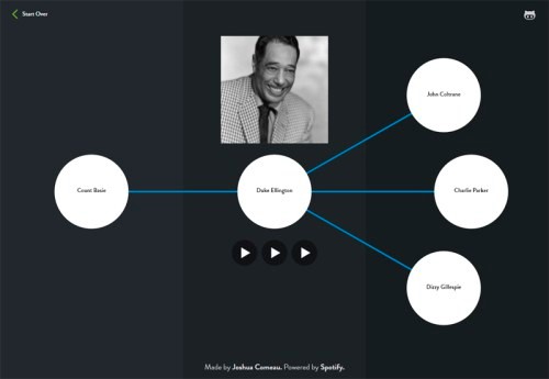 Se utiliza un gráfico que consta de vértices y aristas para representar los datos. En el centro, el artista seleccionado por el usuario, junto con el avatar del artista y algunas muestras de audio de las mejores pistas del artista. A la izquierda hay un vértice que representa el artista anterior, ya la derecha 3 sugerencias. Haciendo clic en los vértices, los usuarios pueden desplazarse hacia delante y hacia atrás a través de su árbol de sugerencias, y así descubrir nuevos artistas y grupos con estilos similares.